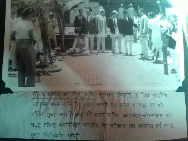 The third angle we need to closely look at is the geopolitics of the time. Since his rule began there was a tremendous movement in India started by Mahatma Gandhi to force the British to give self-rule (swaraj) to India. Many of the politically inclined from Nepal had also gone over to India to support Gandhi in this movement and eventually created political awareness too back home aimed against the dynastic Rana regime, closely linked in their eyes to the British Raj in India. It was during this period of political agitation that some of the ring leaders against Rana rule were charged with sedition and given the death penalty. Four of them have since been celebrated as martyrs after the Rana regime collapsed in Nepal.