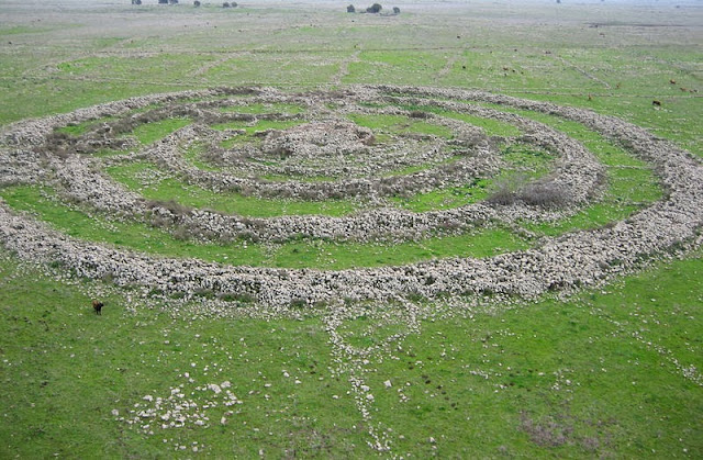 The unique megalithic site of Rogem Hiri, 17 km east of Khirbet Beteiha, includes four stone rings with an inner passage grave and has a diameter of 156 m. Many megalithic structures, including stone circles, menhirs, and dolmens are found along the Jordan Valley.