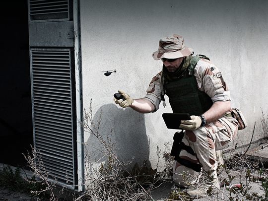 The unit measures around 10 × 2.5 cm (4 × 1 in) and provides troops on the ground with local situational awareness. They are small enough to fit in one hand and weigh just over half an ounce (16 g, including batteries).