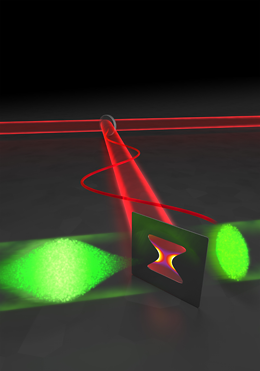 A pulse of electrons (green, coming from the left) encounters a microstructured antenna, which is operated with laser-generated terahertz radiation (red). Thus, the duration of the electron pulse is shortened to a few femtoseconds.