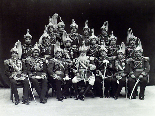 | Right to Left, C-in-C Dhir Shumsher, Jeet Jung, Padma Jung, Ranabir Jung, Juddha Pratap Jung in order of Roll of Succession during the time of Maharjah Ranauddip Singh, circa 1882 A.D. |