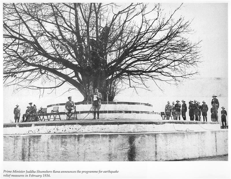 | Prime Minister Juddha Shumsher announcing Earthquake Relief Fund from under the Ficus Tree |