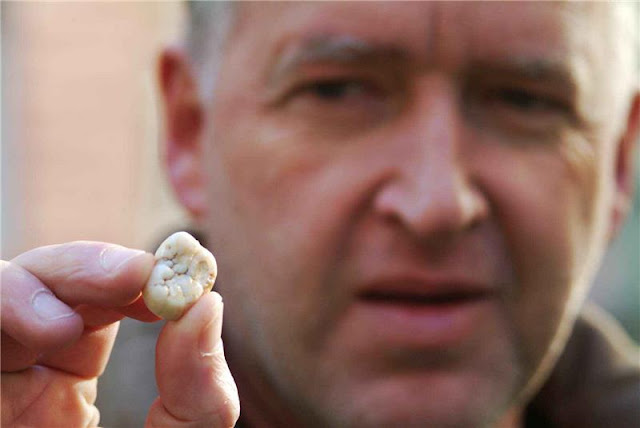 Prof. Dr. Friedemann Schrenk holds a molar (type specimen) of Giganthopithecus.