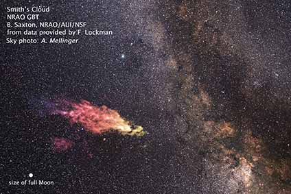 “The Smith Cloud has all the characteristics of a small, infalling dark-matter dominated galaxy, but its gas looks like it came from the outer parts of the Milky Way,” said Jay Lockman, an astronomer with the National Radio Astronomy Observatory (NRAO) in Green Bank, West Virginia, and co-author on a paper describing these results. “There are theoretical calculations suggesting that a dark matter satellite could capture gas as is passes through the Milky Way disk and that may be the amazing circumstance we are witnessing.”