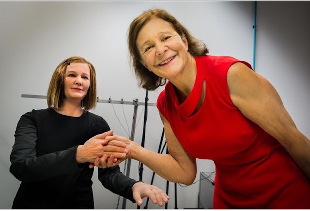 She looks almost like a human being, with soft skin and flowing brunette hair. She smiles when greeting you, looks at you in the eye when talking, and can also shake hands with you. And she is a humanoid.