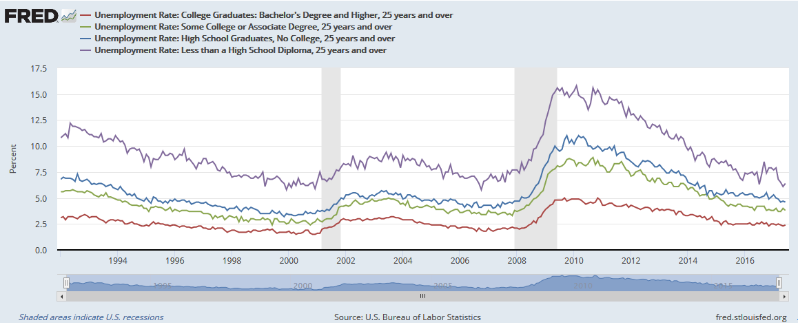 Another way the labor force can be looked at is by education level. That is what the Great Graphic, from the St. Louis Fed shows. There are four educational cohorts tracked for people at least 25 years old. From top to bottom they are no high school degree (purple); high school graduate but no college (blue); some college or Associate Degree (green), college graduates with a Bachelor’s Degree or more (red).