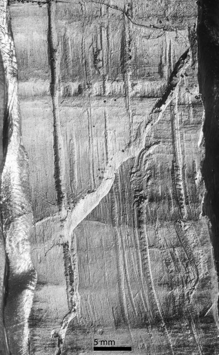 Closeup of an epoxy cast of transverse cut marks on the base of the Page-Ladson mastodon tusk. Diagonal feature is a fracture through the outer layer.