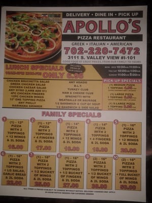 Apollos Pizza restaurant is among the best pizza’s in the Southwest and one of the best joints in Las Vegas, to get a great pizza for a great prize. Apollo’s Pizzeria is family own. Apollo’s serves hoagies, gyro’s, pasta, pizza, salads, soups , burgers, appetizers, chicken and desserts among other dishes.